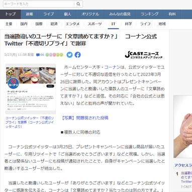 ホームセンターのコーナンが、公式ツイッターで複数のユーザーに不適切な返信をしたと謝罪した。同ツイッターアカウントが、キャンペーンに当選したと勘違いしたユーザーに「文章読めてますか?」などと返信したため、批判が相次いでいた。今後は、お客様の状況をしっかり把握し、適切に対応するとしている。